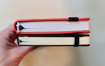 I didn’t know all that background about the company before I ordered, but from what I could see online, this notebook seemed worth a try: 3.5 x 5.5″ format, red cover with stitched edge, and at 240 pages, it has a sort of thicker look without too much overhang. Shown with a pocket size Moleskine for comparison below.