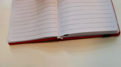When my order arrived, I thought the notebook looked pretty good– everything noted above was true to the description. The bright red cover feels nice and substantial. The wide elastic band seems sturdy, and it’s tight enough to sit neatly on the back cover without flopping around when you aren’t using it. But then the dream started to die…
