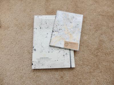 The larger version of the leather sketchbooks made me say “Wow.” At 8.75×12.25″, it is a generously sized and substantial book, and I’ve never encountered a marbleized painted leather cover like this. The cover is really beautiful. There is a line of stitching on the back cover, perhaps just because it is easier for them to use two separate pieces of leather to bind such a large sketchbook– the smaller leather journals don’t have the stitching (I didn’t unwrap or test the smaller journal).
