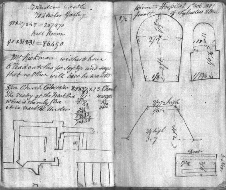 The notebook has a strange mixture of information in it ranging from firstly, quite detailed dimensioned survey sketches that he drew, complete with the calculations necessary to establish the size and number of warm air stoves required to heat the premises. Other pages give various scientific technical notes on,