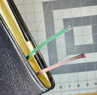 And I almost forgot 2 other very basic but important steps that I usually do before I even start with anything else: I write my name and contact details inside the front cover. And I always put nail polish on the ends of the ribbon markers so they won’t fray. (I do this with any notebook that has a ribbon marker.)